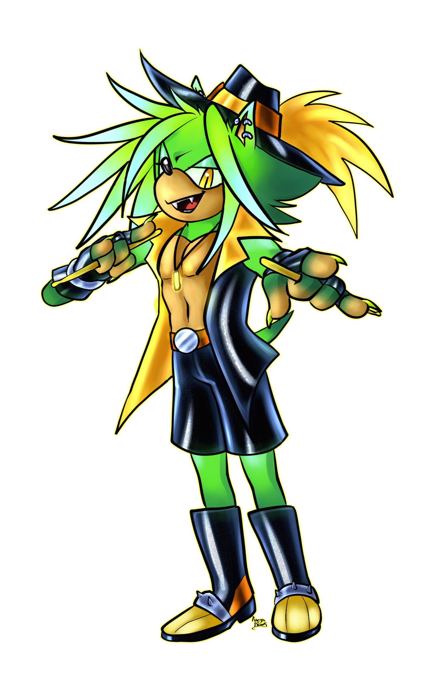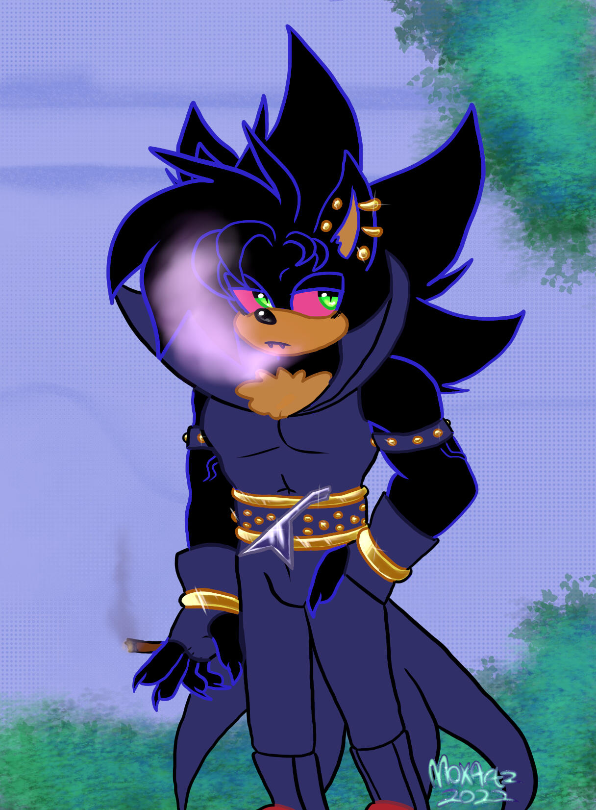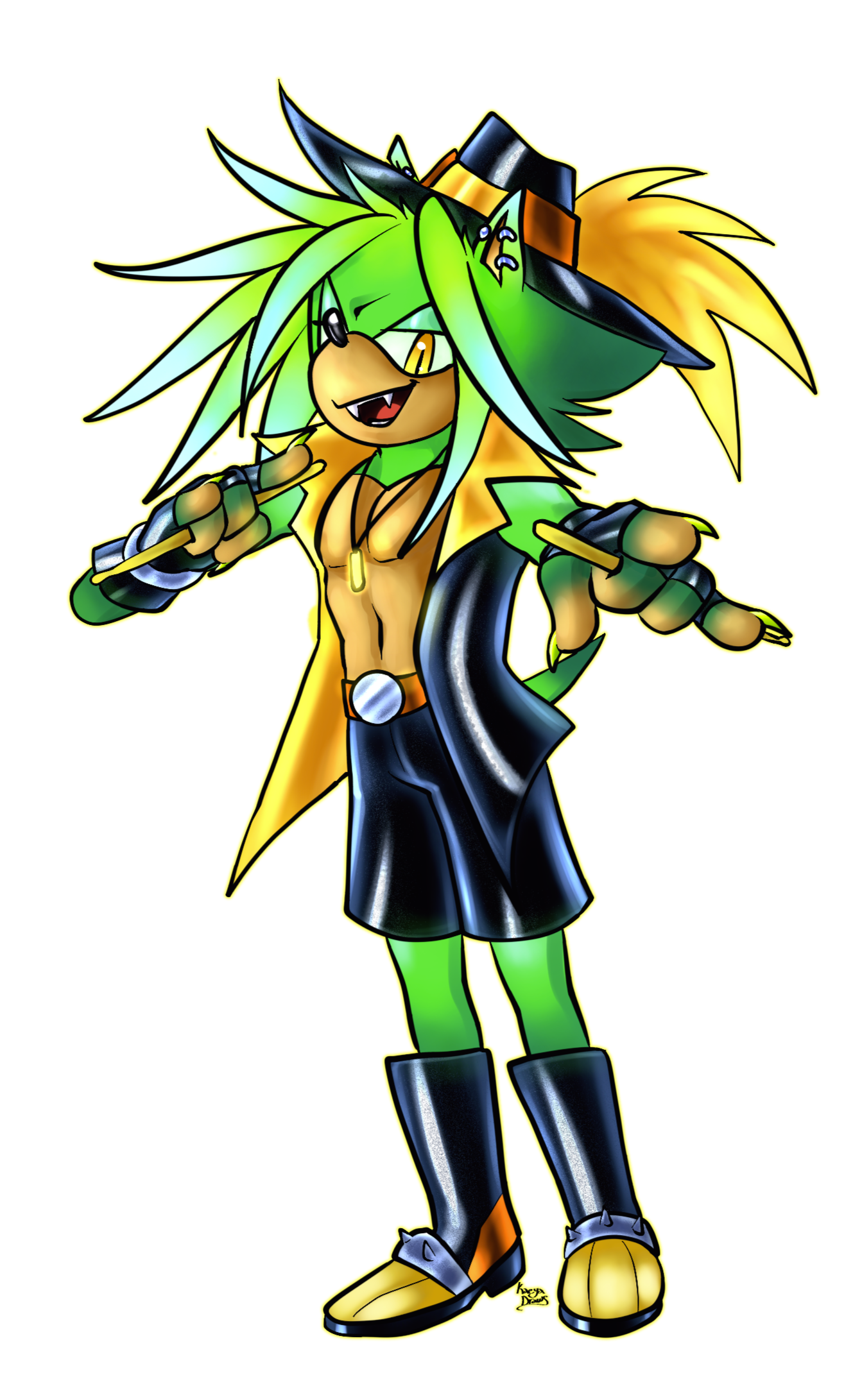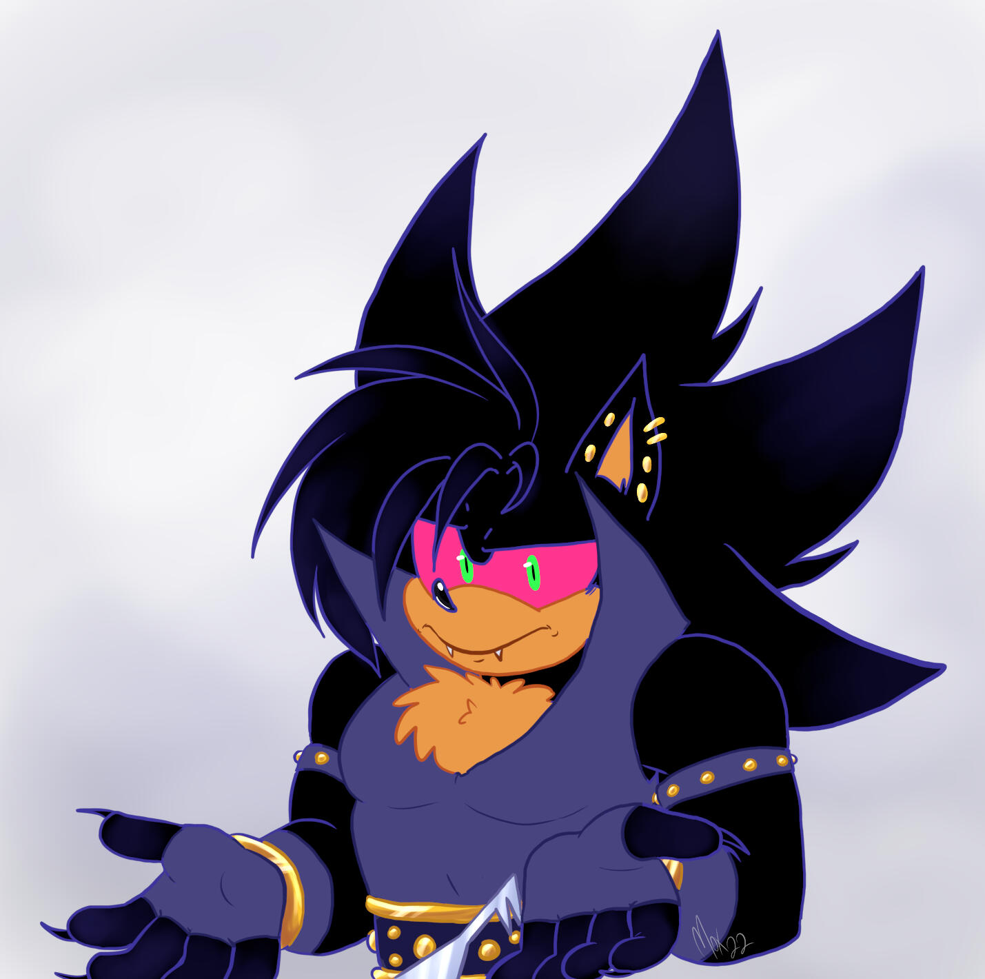 Age: 2537 | Gender: Male | Species: Hedgehog, Vampire | Preference: Pansexual | Build: Athletic | Voice Claim: Chase Holfelder, Yuugen Vinny, Caleb HylesPersonality: Laid-back and mischievous, masking a strategic, intelligent mind. Thrives on chaos, improvisation, and risk. Loyal and principled despite playful, unpredictable behavior. Balances Slade’s grounding and Vania’s decisiveness.Quirks & Habits: Fidgets/doodles, teases siblings, tests limits with pranks or spontaneous performances, uses charm to manipulate social situations.Interactions: Slade – stoic older twin, target for challenge; Vania – admires & playfully undermines; Carna – chaos partner, mutual respect.Skills: Expert hacker/inventor, dexterous and stealthy, combat intelligence with wit & agility, master percussionist integrating improvisation & hypnotic effects, misdirection & psychological manipulation.Combat & Stage Style: Agile, improvisational combat using environment, misdirection, and percussion rhythms. On stage, amplifies band energy, bringing chaotic, playful charisma.Abilities: Superhuman speed, agility, endurance, and durability; heightened senses, telepathy, and trance hypnosis; immortality; hypnotic vocals for combat and performance; enhanced dexterity & reflexes; chaos intuition.Weaknesses: Overplays carefree persona, emotional blind spots, dependent on group harmony, blood/feeding vulnerabilities, sunlight/UV weak, susceptible to stakes and beheading, overindulgence in sensation.Story: Youngest sibling in ancient vampire royal family. Naturally inventive, curious, and tactically gifted. Raised closely with Vania, distant from Slade due to prophecy. Stepped into protective, strategic role during apocalyptic events. Guided surviving coven through a portal to a new world. Now in Scarlet Club, bringing chaos, ingenuity, and rhythm to the band.
